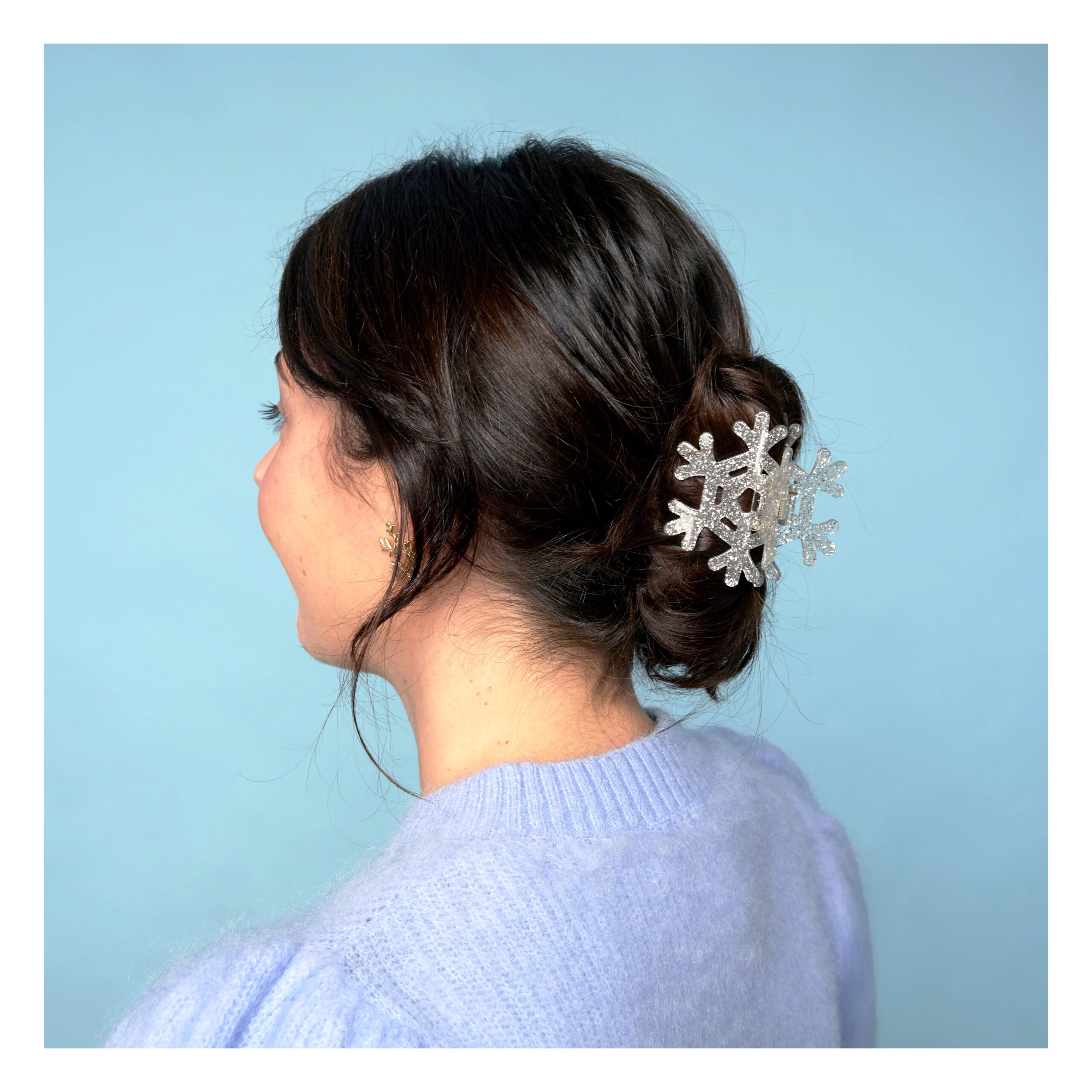 O que seria a magia do Natal sem grandes flocos caindo do céu? Enquanto o céu realiza nossos sonhos encantados, usamos esta mola de cabelo com glitter que se destaca lindamente em todos os tipos de cabelo.